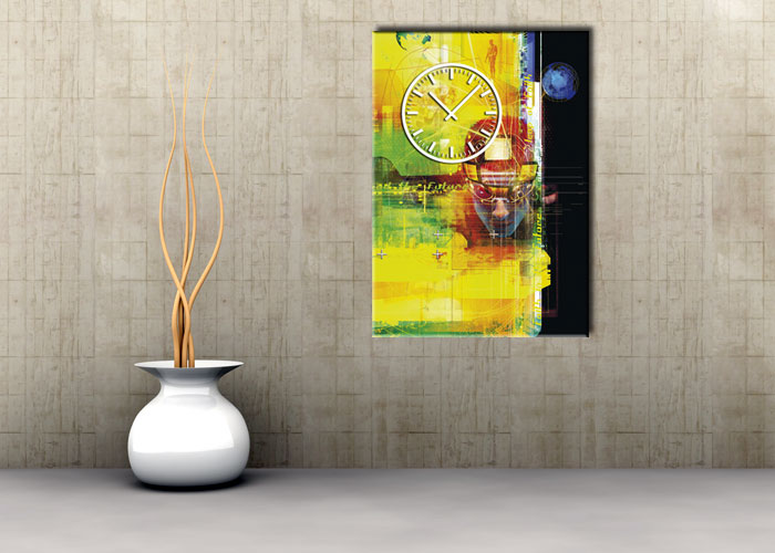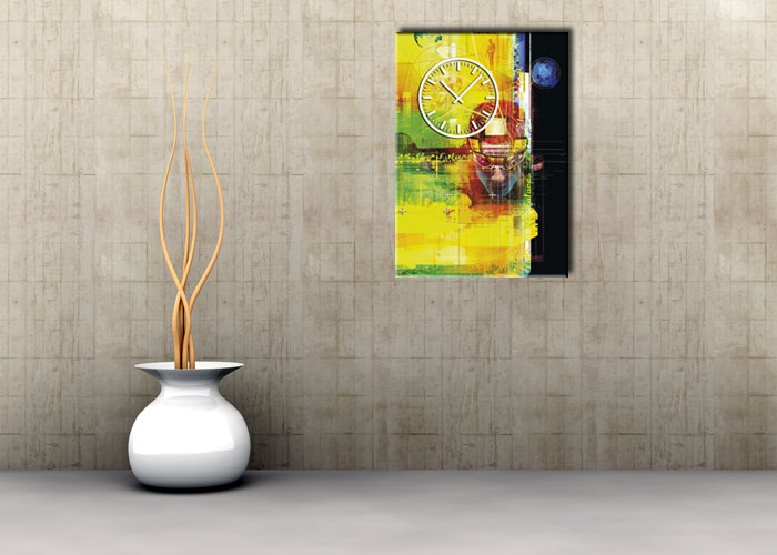 Das künstlerische Motiv wird auf eine hochwertige Aluminium-Dibond-Platte übertragen. Durch den hochauflösenden Digitaldruck besticht der Druck mit feinen Details und klaren Farben. Zudem werden die Oberflächen der Wanduhr mit einer seidenmatten, hauchdünnen, kratzfesten UV-Schutzfolie versehen. So ist die Uhr langfristig geschützt und es entstehen keine störenden Spiegelungen. Die ökologischen Latextinten sind zudem besonders geeignete Materialien für eine langlebige und gestochen scharfe Bildqualität.