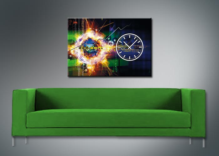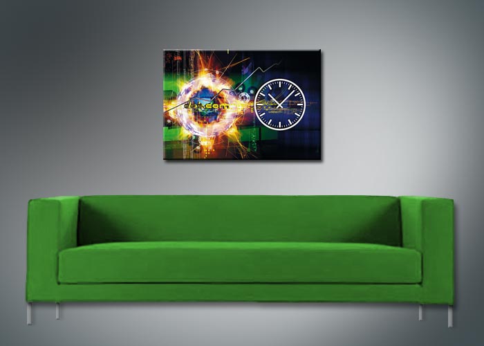 Das künstlerische Motiv wird auf eine hochwertige Aluminium-Dibond-Platte übertragen. Durch den hochauflösenden Digitaldruck besticht der Druck mit feinen Details und klaren Farben. Zudem werden die Oberflächen der Wanduhr mit einer seidenmatten, hauchdünnen, kratzfesten UV-Schutzfolie versehen. So ist die Uhr langfristig geschützt und es entstehen keine störenden Spiegelungen. Die ökologischen Latextinten sind zudem besonders geeignete Materialien für eine langlebige und gestochen scharfe Bildqualität.