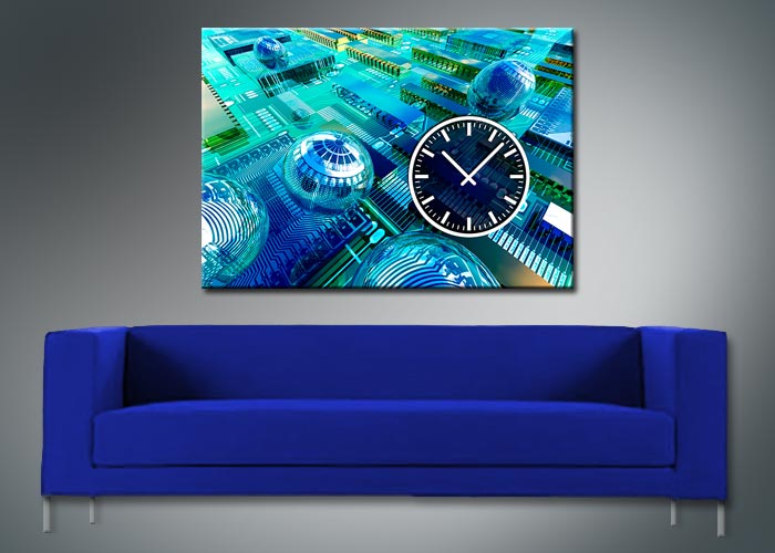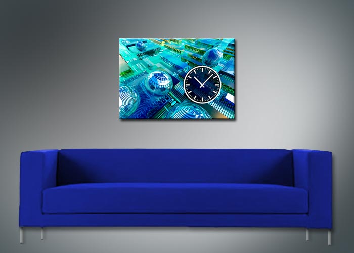 Das künstlerische Motiv wird auf eine hochwertige Aluminium-Dibond-Platte übertragen. Durch den hochauflösenden Digitaldruck besticht der Druck mit feinen Details und klaren Farben. Zudem werden die Oberflächen der Wanduhr mit einer seidenmatten, hauchdünnen, kratzfesten UV-Schutzfolie versehen. So ist die Uhr langfristig geschützt und es entstehen keine störenden Spiegelungen. Die ökologischen Latextinten sind zudem besonders geeignete Materialien für eine langlebige und gestochen scharfe Bildqualität.