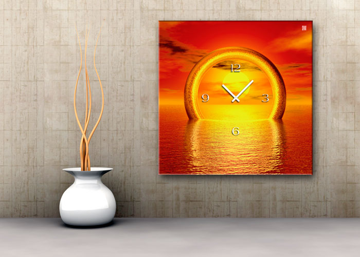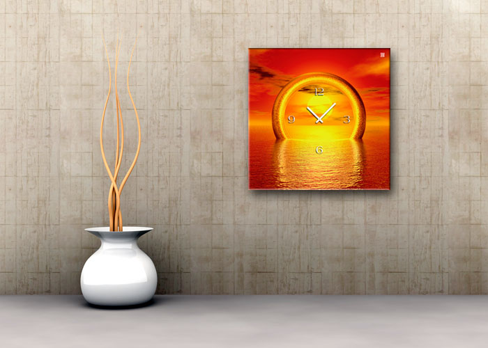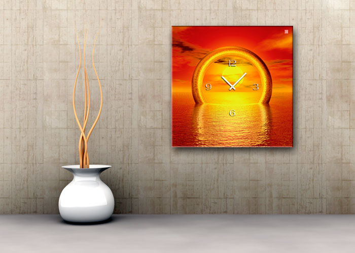 Das künstlerische Motiv wird auf eine hochwertige Aluminium-Dibond-Platte übertragen. Durch den hochauflösenden Digitaldruck besticht der Druck mit feinen Details und klaren Farben. Zudem werden die Oberflächen der Wanduhr mit einer seidenmatten, hauchdünnen, kratzfesten UV-Schutzfolie versehen. So ist die Uhr langfristig geschützt und es entstehen keine störenden Spiegelungen. Die ökologischen Latextinten sind zudem besonders geeignete Materialien für eine langlebige und gestochen scharfe Bildqualität.
