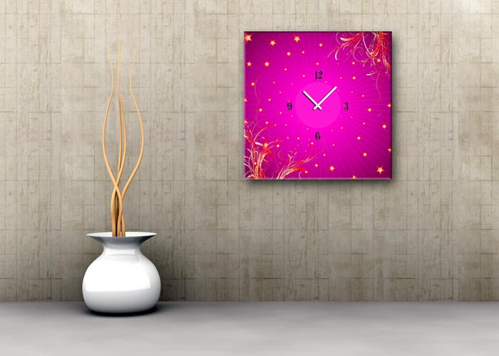 Das künstlerische Motiv wird auf eine hochwertige Aluminium-Dibond-Platte übertragen. Durch den hochauflösenden Digitaldruck besticht der Druck mit feinen Details und klaren Farben. Zudem werden die Oberflächen der Wanduhr mit einer seidenmatten, hauchdünnen, kratzfesten UV-Schutzfolie versehen. So ist die Uhr langfristig geschützt und es entstehen keine störenden Spiegelungen. Die ökologischen Latextinten sind zudem besonders geeignete Materialien für eine langlebige und gestochen scharfe Bildqualität.