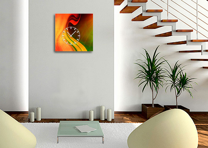 Das künstlerische Motiv wird auf eine hochwertige Aluminium-Dibond-Platte übertragen. Durch den hochauflösenden Digitaldruck besticht der Druck mit feinen Details und klaren Farben. Zudem werden die Oberflächen der Wanduhr mit einer seidenmatten, hauchdünnen, kratzfesten UV-Schutzfolie versehen. So ist die Uhr langfristig geschützt und es entstehen keine störenden Spiegelungen. Die ökologischen Latextinten sind zudem besonders geeignete Materialien für eine langlebige und gestochen scharfe Bildqualität.
