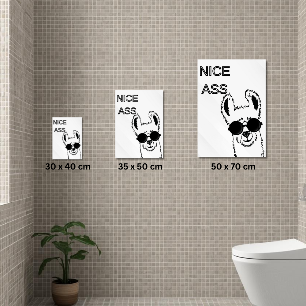 Dieses witzige Lama-Alu-Dibond-Wandbild bringt Humor und Stil perfekt zusammen. Das minimalistische Schwarz-Weiß-Design mit Sonnenbrille und frechem „Nice Ass“ Schriftzug sorgt garantiert für Aufmerksamkeit und lockert jede Einrichtung auf.
